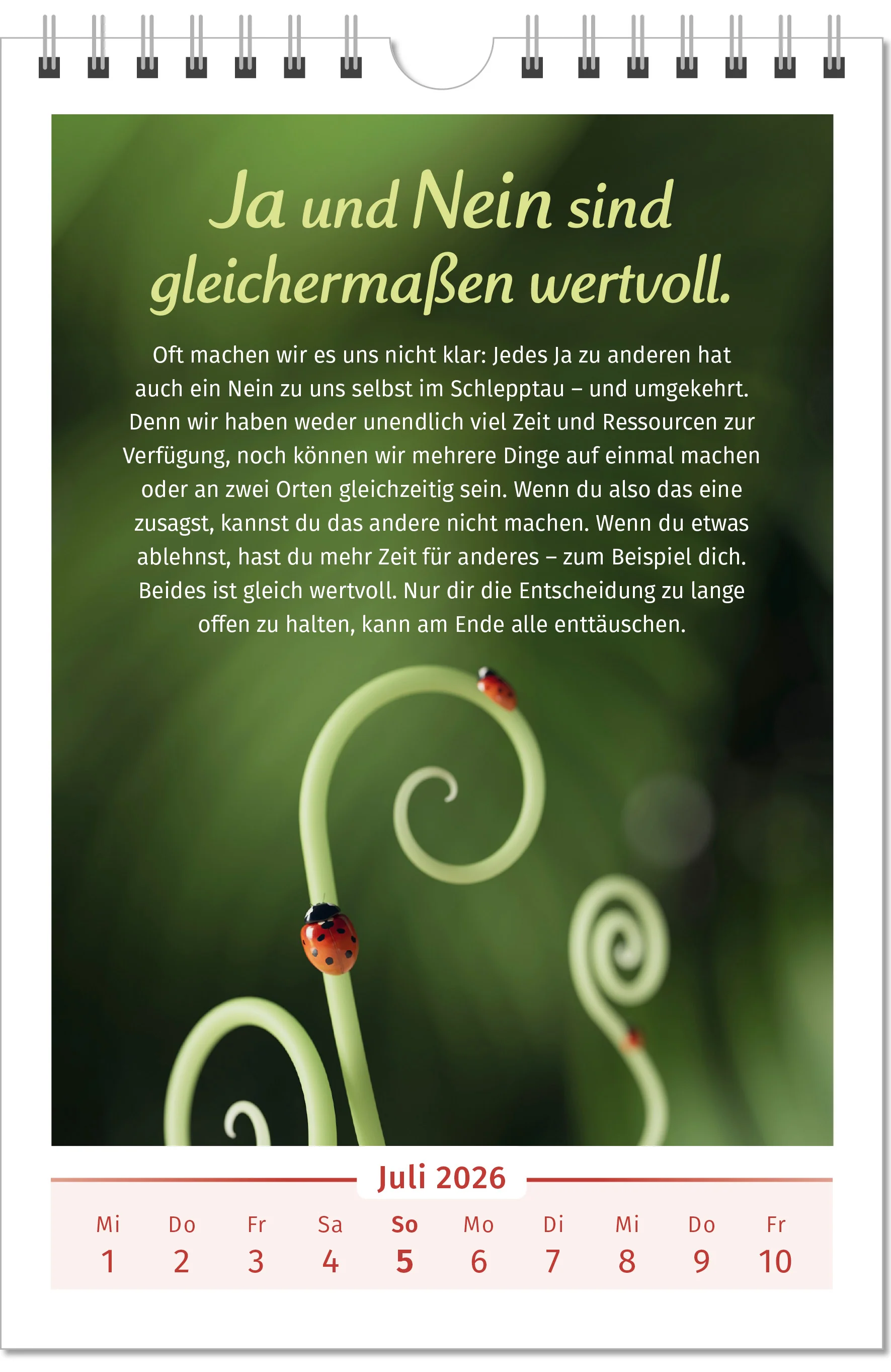 Aufbauend, stärkend, positiv: Der Lebensfreude-Kalender ist ein Original und erscheint zum zweiten Mal im größeren Ausgabeformat von 23,2 x 34,4 cm! Mit größerer Schrift und größeren Fotomotiven. Die motivierenden Ratschlägen, einfühlsamen Lebensweisheiten und stärkenden Achtsamkeitsübungen auf jedem Kalenderblatt lenken den Blick auf das, was im Leben wichtig und schön ist. Das Besondere: Damit die Leserinnen und Leser aus den gewohnten Mustern rauskommen und neue Anregung erfahren, ist das Kalendarium in einem 10-Tagesrhythmus gegliedert. Das macht den Kalender zu einem hilfreichen Begleiter und zu einer Quelle der Inspiration!